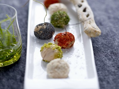 tiges séchées d'herbes aromatiques (thym ou romarin) pour un effet plus poétique. - 5Aumoment de passer à table, assaisonner légèrement les billes de foie gras avec la fleur de selpuis les rouler dans les graines de pavot, le piment d'Espelette, le sésame, les algues ou les pistaches.