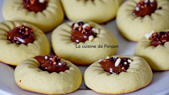 Enfourner dans un four préchauffé à 180°C pendant 18 min. Laisser refroidir sur une grille. Garnir ensuite les biscuits avec la confiture de lait au cacao et noisettes et parsemer de meringue 3 chocolats.