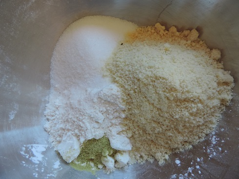 1Dans un saladier, mélanger la farine, le sucre fin, la poudre d'amande, la levure, la poudre de combava et mélanger. Réserver.