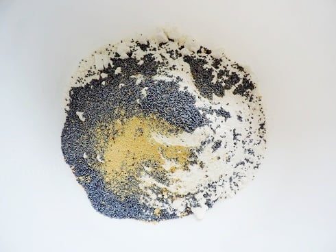 2Dans une saladier, mélanger la farine, les graines de pavot et la poudre d'écorce de combava.
