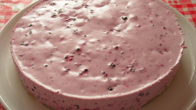 Une base fine en gâteau surmontée d'une crème à la mûre sauvage.