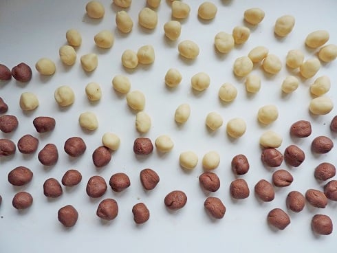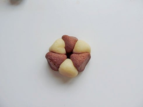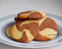 1Dans un saladier, mélanger le beurre mou avec le sucre. Ajouter la poudre d'amande et mélanger. Ajouter l'huile et mélanger. Ajouter la farine et la levure et mélanger. Diviser la pâte en 2 parts égales. Dans une part, ajouter le cacao et mélanger. Garder l'autre part telle quelle. Diviser les 2 pâtes en petites boules d'environ 5g.