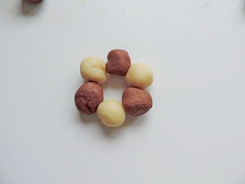 2Disposer 3 boules de chaque sorte comme sur la photo, les rassembler et les tourner entre les paumes des mains bien plates afin d'obtenir des spirales.