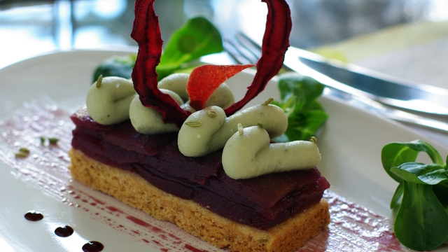 Décoration : chips de betterave et chips de jambon, sirop de pochage réduit au 3/4.