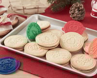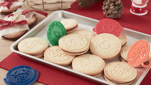 Ensuite, faites pression avec le tampon pour laisser une empreinte sur vos biscuits, en faisant attention à ce que les contours des biscuits soient à l’extérieur du tampon (n’appuyez pas trop fort, sinon la pâte collera au tampon).