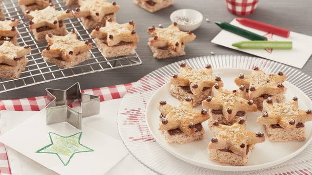 Assemblez un carré de moelleux et un sablé en forme d’étoile avec 7 g de Nutella® entre les deux pour les faire adhérer. Répétez cette opération avec les biscuits restants.