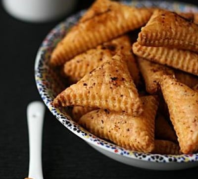 Etalez la pâte au rouleau sur 8 mm d'épaisseur. A l'aide d'une roulette à pâte cannelée, découpez des triangles ou autres formes de votre choix (vous pouvez utilisez des emportes pièces ou tout simplement un couteau).