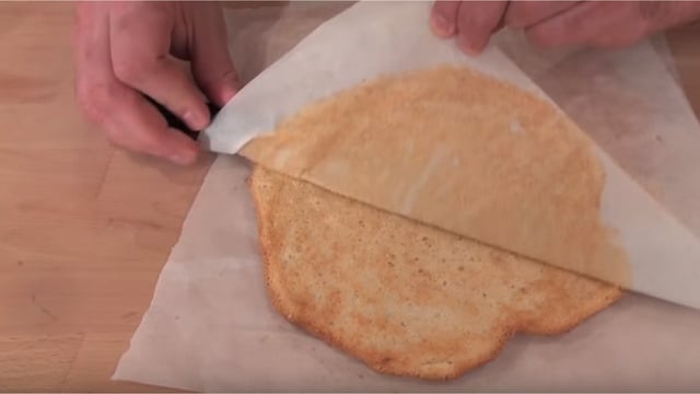 Cuisez à 200°C environ 10min sur une feuille de papier sulfurisé. A la sortie du four décollez le biscuit de la feuille et le couvrir pour ne pas qu'il sèche. Terminez par le taillez de la taille désirée.