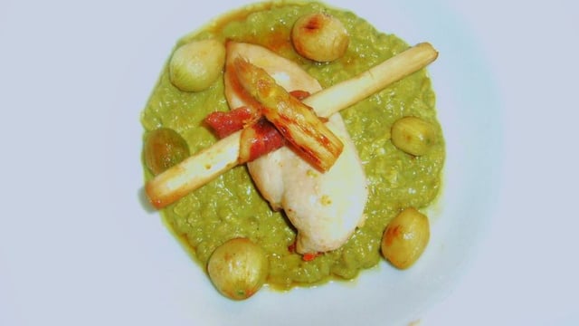 Une crème de petits pois aux échalotes pleine de douceur, des asperges cuites entourées de pancetta dans un bouillon de volaille et un filet de poulet rôti à l'ail.