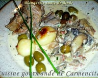 Lavez le citron et l'épluchez en faisant en sorte d'avoir une bande. Mettez la peau du citron dans la blanquette, ajoutez les olives et faites cuire à petit feu pendant 30 mn. Ajoutez la crème fraîche et laissez cuire à nouveaux 5 mn à feu doux .
