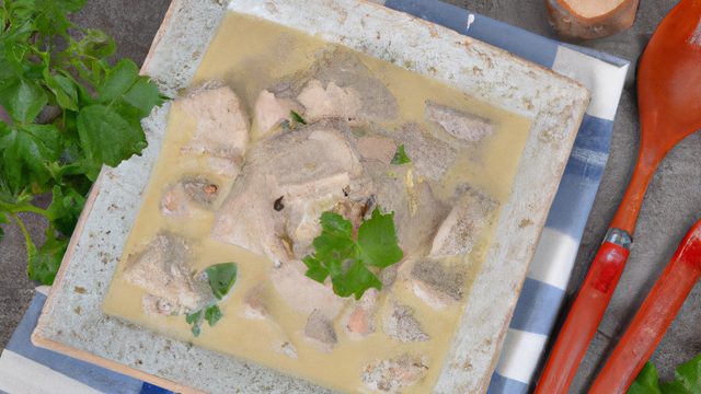Lorsque la viande a fini de mijoter, récupérer 1 litre de bouillon, le filtrer et le verser dans la casserole contenant le roux beurre + farine en fouettant. Porter le tout à ébullition et laisser chauffer 5 min à feu doux. Assaisonner. Battre les jaunes d'oeufs et y incorporer la crème. Ajouter une louche de bouillon, délayer et reverser le tout dans la casserole.