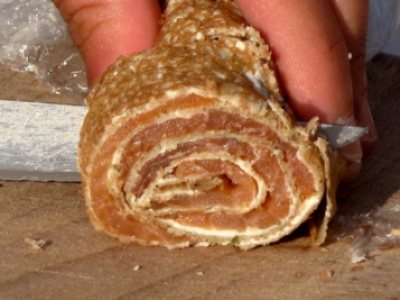 - 1Ouvrez votre crêpe - étalez le fromage frais.Déposez vos tranches de saumon fumé et roulez la crêpe sur elle-même le plus serré possible.