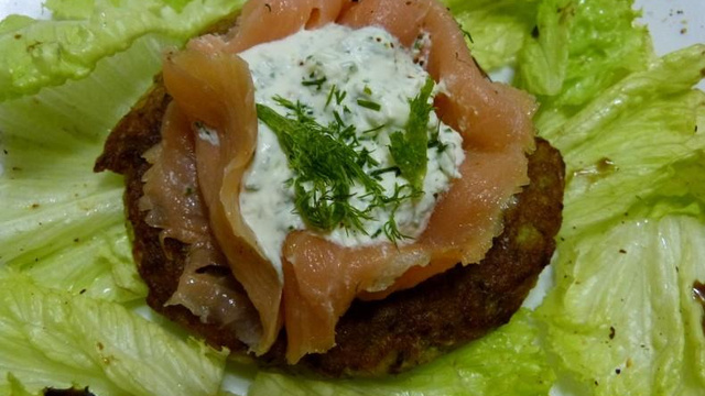 Des blinis à base de courgettes, surmontés d'une délicieuse sauce au fromage St Môret à l'aneth, relevée avec du vinaigre de Xérès qui finit de sublimer cette sauce, un délice.