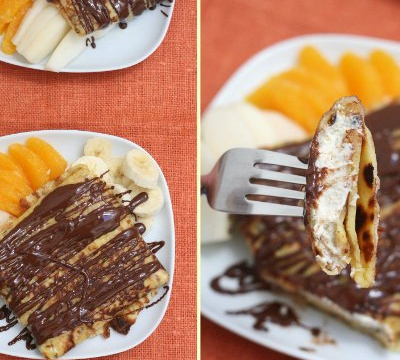 La recette originale préconise de faire brunir les blintzes badigeonnés d'un peu de beurre dans la poêle pour les réchauffer, j'ai opté pour un rapide passage sous le grill du four de peur de massacrer les Blintzes... à vous de voir quelle méthode vous préférez. Servir les Blintzes bien chauds avec les fruits frais mélangés et les recouvrir d'un filet de chocolat fondu.