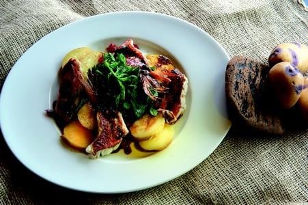 Dresser les pommes de terre en alternant une blanche et une jaune et le rouget. Faire un tour de moulin à poivre sur les pommes de terre et finir par un filet de caramel au soja sur le pourtour de l'assiette et le rouget.