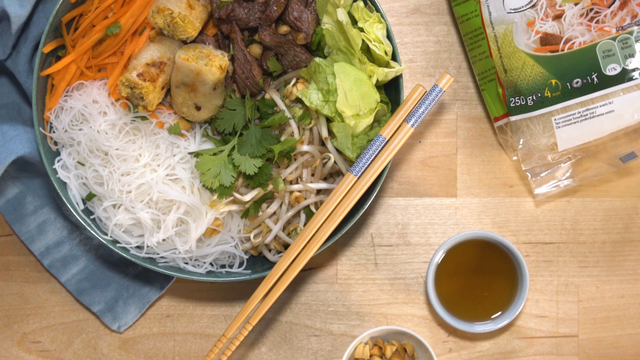 Lavez et séchez la salade et la coriandre. Coupez la salade en lanières. Répartissez la salade dans 4 grands bols. Ajoutez les vermicelle de riz, les carottes râpées, les pousses de soja et la viande. Assaisonnez avec la sauce, saupoudrez de cacahuètes concassées et de coriandre ciselée et les nems coupés en deux. Servez aussitôt.