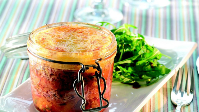 Terminer par une couche de purée de pomme de terre pour arriver presque en haut du bocal. Parsemer du Comté râpé sur la purée de pomme de terre. Mettre au four pendant 15 à 20 minutes dans un four préchauffé à 200 °C. Le fromage doit être fondu et gratiné.