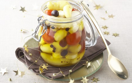 Dans un bocal, déposez en alternance les Fine de Ratte du Touquet, les tomates cerise, le chèvre et les olives. Parsemez des graines de coriandre, des baies de genièvre et du zest de citron.