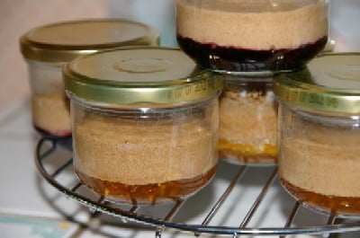 Déposer au fond de chaque bocal quelques cuillères d'abricots et recouvrir avec l'appareil à biscuit cacao.