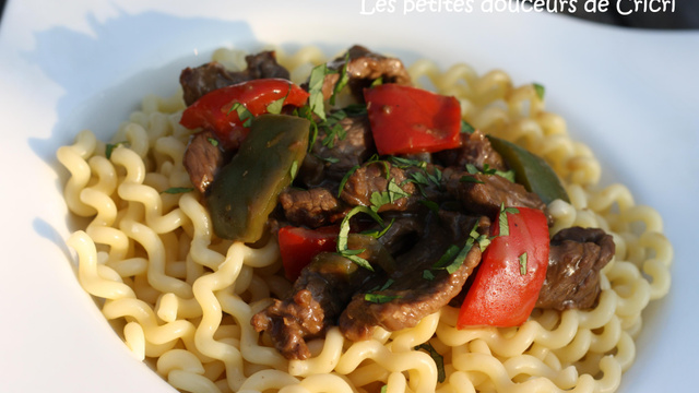 Boeuf mariné au vinaigre au jus de mandarine et cuisiné au wok.