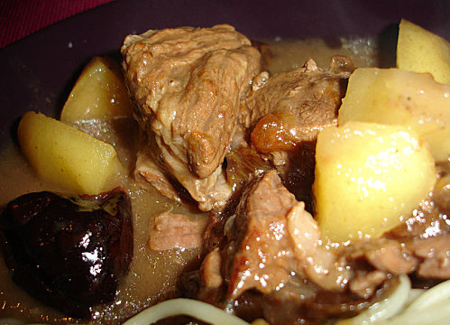 Pelez les pommes et coupez-les en gros morceaux. Au bout de 2h40 de cuisson, ajoutez les pommes et les pruneaux, rectifiez l'assaisonnement et poursuivez la cuisson 30 min.