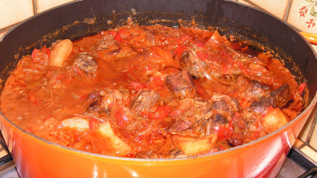 Ajoutez la pomme de terre, le concentrés de tomates, le paprika, le cumin, salez (très légèrement si le bouillon est déjà salé), poivrez et mélangez à nouveau. Versez le bouillon, portez doucement à la limite de l'ébullition, puis baissez le feu, couvrez et faites cuire au moins 3 heures pour que la viande soit tout à fait fondante. Si à mi cuisson la sauce vous parait très liquide, vous pouvez entrouvrir le couvercle de la cocotte pour lui permettre de s'évaporer.