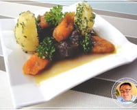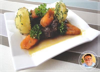 - 2Le lendemain, égouttez le tout et récupérez la marinade que vous filtrez au chinois. Dans un faitout faire chauffer de l'huile d'olive. Y saisir les morceaux de viande et le lard, bien les colorer. Ajoutez les légumes puis couvrir avec la marinade. Cuire 2 h 00 à feu doux. A 20 min de la fin ajoutez les pommes de terre coupées en 2. A 10 min de la fin ajoutez 1 cuillère de moutarde à l'ancienne. Pour la présentation saupoudrez de thym et de persil. Servir chaud.