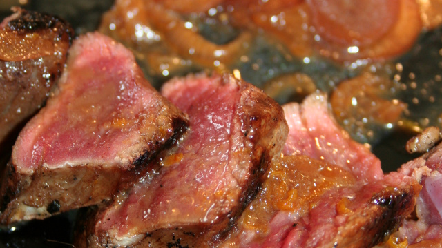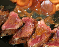 Laissez reposer la viande pendant 1 ou 2 minutes puis coupez-en de fines tranches. Servez avec la réduction et des carottes sautées à la mode thaïe.