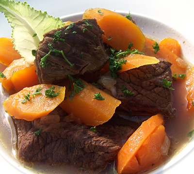 - 2Retirer du feu et ajouter le bouillon et le vin en remuant. Mijoter à feu moyen jusqu'à ébullition et épaississement. Remettre le boeuf et son jus de cuisson. Ajouter les feuilles de laurier et le bouquet garni. Saler et poivrer. Couvrir et laisser mijoter au minimum 2 bonnes heures en remuant de temps à autre. Saupoudrer de persil et servir.