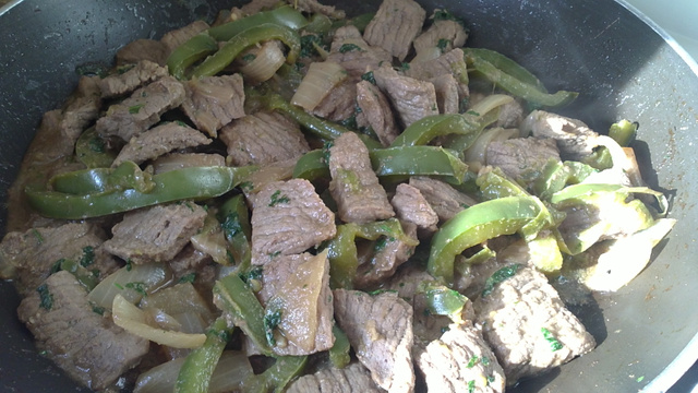 - 1. Découpez le boeuf "contre le grain " en lamelles.2. Mélangez intimement dans un saladier tous les éléments de la marinade. Ajoutez-y ensuite la viande. Laissez mariner 1 heure en retournant de temps en temps.3. Découpez les poivrons et l'oignon en lamelles4. Écrasez la gousse d'ail.
