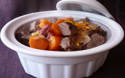 Dans une cocotte en fonte, faire dorer le boeuf, les lardons et les carottes pendant environ 10 minutes. Inutile d'ajouter de la matière grasse. Lorsque toute l'eau s'est évaporée, verser le cognac et flamber.