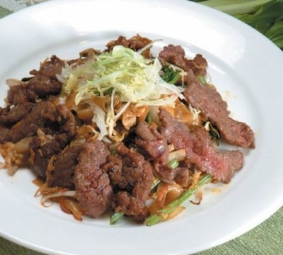 Faire mariner les lanières de viande, pendant 20 minutes, dans un mélange de 1 dl de saké, 4 cuillères à soupe de sauce soja et 1 cuillère à café de gingembre.