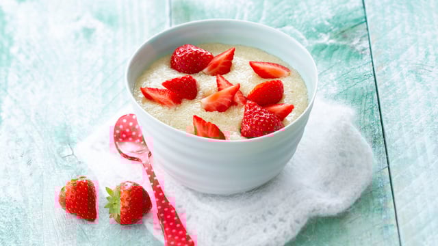 Préparer les fraises : les laver, les équeuter et les couper en morceaux. Les déposer dans les assiettes creuses (ou bols) des enfants.