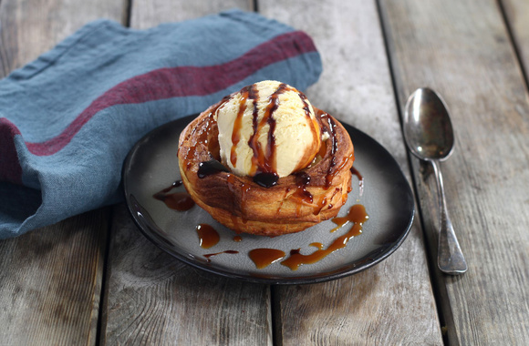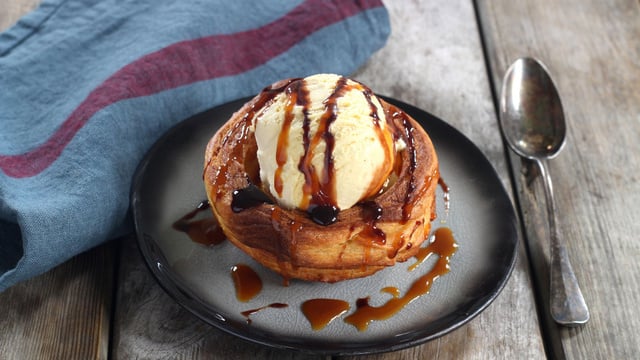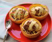 11Laissez tiédir les coupelles puis rétirez-les délicatement du moule. Servez-les avec une boule de glace à la vanille, du coulis de chocolat et de caramel.