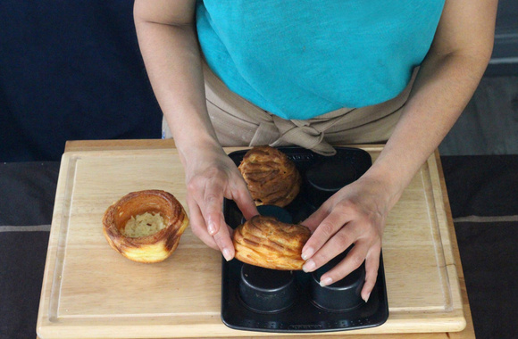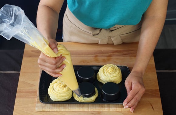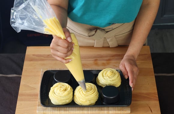 9Dressez les coupelles de pâte à chou à l'aide d'une poche à douille lisse sur le dos d'un moule à muffins en métal préablement beurré.