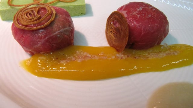 Bonbon de faux filet de boeuf et mangue