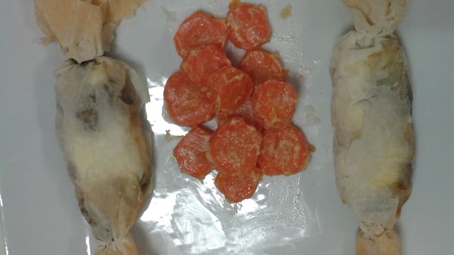 Feuille de brick repliée en bonbon contenant du veau, des aubergines et du Saint-Morêt.
