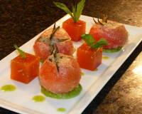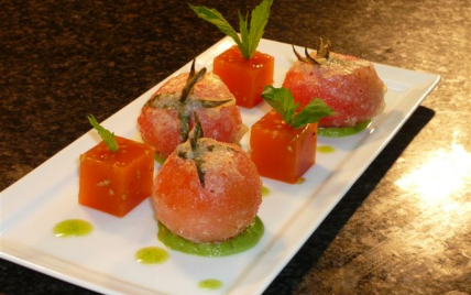 Farcir le partie basse de la tomate avec une bille de mozzarella enrobée au pistou, et recouvrir avec la deuxième partie de la tomate