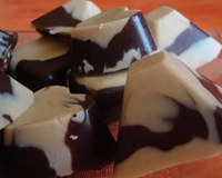 Rendre le moule à chocolat et déposer un peu de chocolat blanc au cacahuètes dans le fond des empreintes. Disposer ensuite un peu de chocolat noir puis finir par une couche de chocolat blanc et secouer doucement pour étaler le mélange.