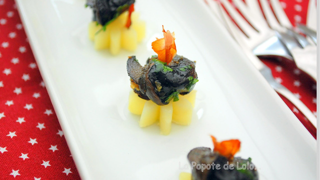 Découpez les pdt à l'aide d'un emporte-pièce (fleur, étoile....), déposez un escargot, un peu de persil et un petit morceaux de speck séché. Dégustez....