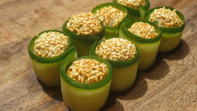 Déposer les graines de sésame torréfiées dans une sous-tasse puis y passer une des faces de chaque boulettes. Encercler chaque boulette avec une bandelette de concombre puis les ranger en quinconce dans un plat. Servir.