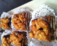 A l'aide d'un petit emporte pièce, découper l'appareil à la noix de coco en un nombre pair de morceaux (chaque bouchée aura une base et un chapeau) et en privilégiant des formes carrés ou rectangulaires pour diminuer les pertes.