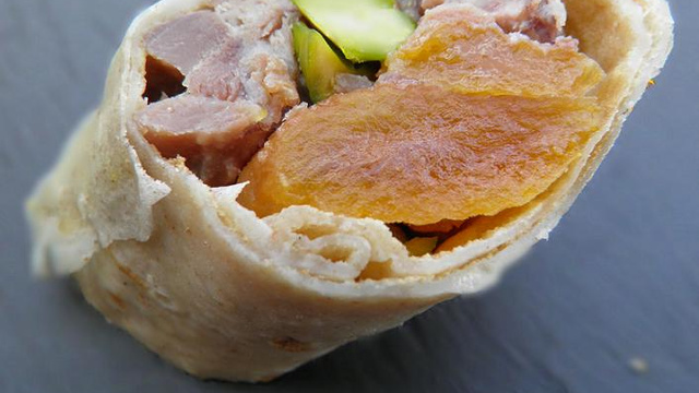 Répartir 2CS de confit de canard au milieu de la crêpe, sur toute la longueur et sur une épaisseur de 2cm environ. Ajouter les abricots coupés en deux, par dessus, puis les pistaches.