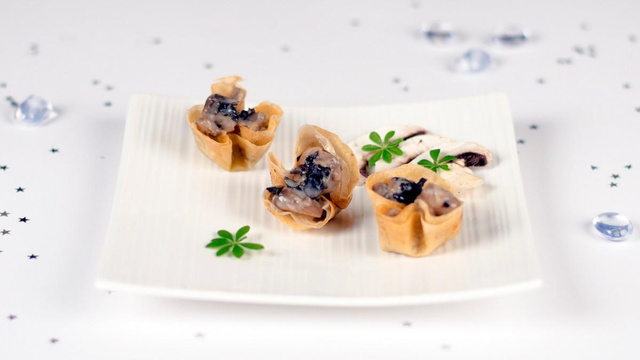 Tassez-les bien au fond des moules. Glissez au four et cuisez-les 10 à 15 minutes pour qu''elles soient dorées et croustillantes. Réchauffez les champignons en ajoutant les champignons noirs bien égouttés, ajoutez 1 cuillerée à café de sauce soja et remplir les corolles croustillantes. Servez bien chaud.