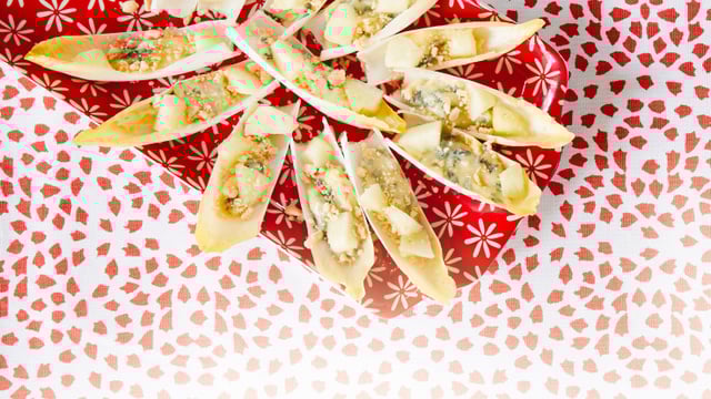 Émiettez le bleu et mélangez-le aux dés de pomme. Effeuillez les jeunes pousses d’Endives, puis remplissez-les avec le mélange bleu/pomme.
