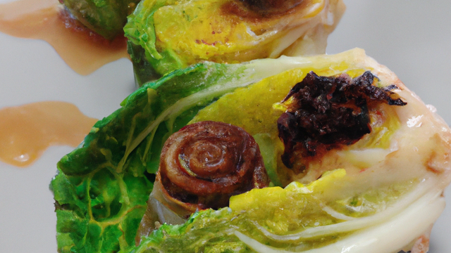 Recouvrir la natte à sushi de film transparent puis badigeonner avec un peu de graisse de canard. Sur la moitié de la natte superposer la moitié des feuilles de choux côté extérieur en-dessous en les faisant légèrement se chevaucher. Au centre répartir la chair de confit émiettée, saupoudrer avec le mélange 5-épices et tasser un peu.