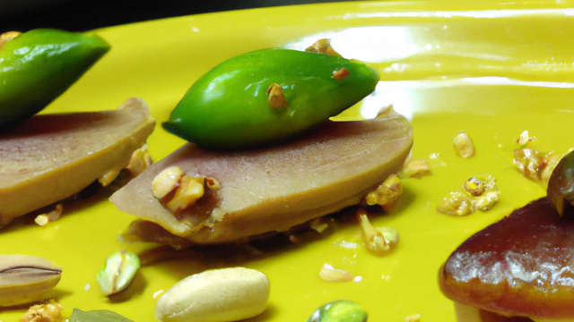 Former dans chaque assiette trois petits « socles » de Ratte du Touquet écrasées, et déposer sur tous une bouchée de foie gras. Ajouter à leurs côtés une cuillérée de pistaches en poudre et une pincée de piment d'Espelette.