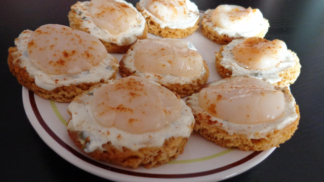 Tartiner les ronds de pain d'épices de st Môret, surmonter d'une rondelle de st jacques, parsemer d'une pincée de paprika et servir.