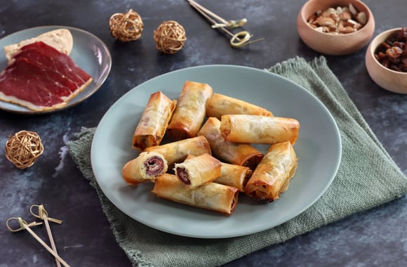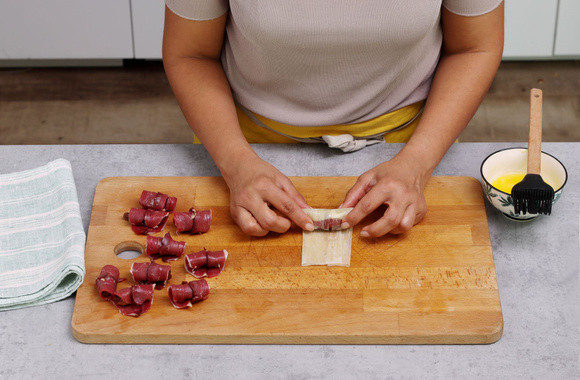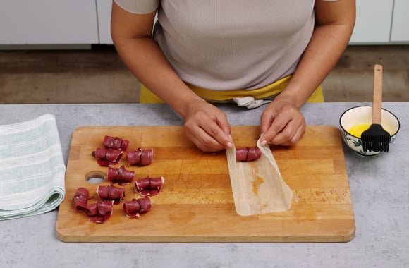 6Déposez sur chaque bande un roulée de Magret fumé puis rabattez les bords de pâte filo.