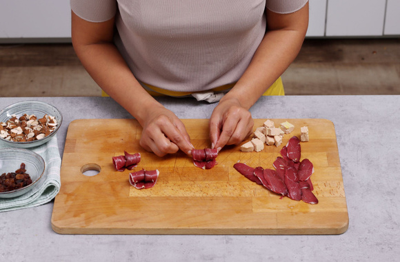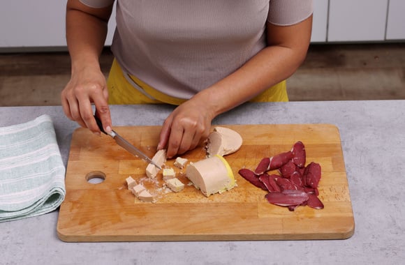 3Superposez légèrement 2 tranches de Magret fumé, déposez un dé de foie gras sur le bord.
